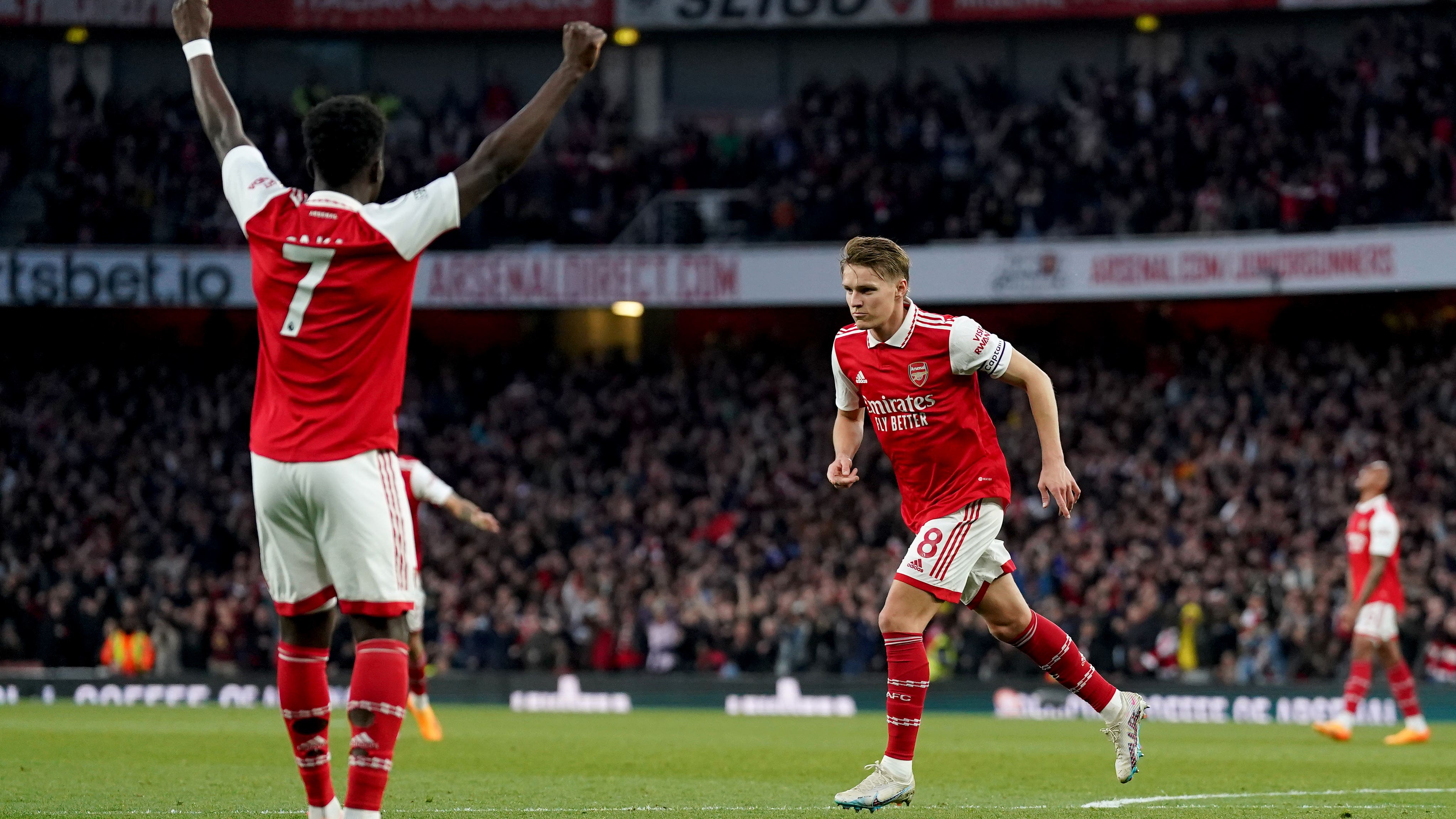 | Martin Odegaard dari Arsenal merayakan gol pembuka (PA) |