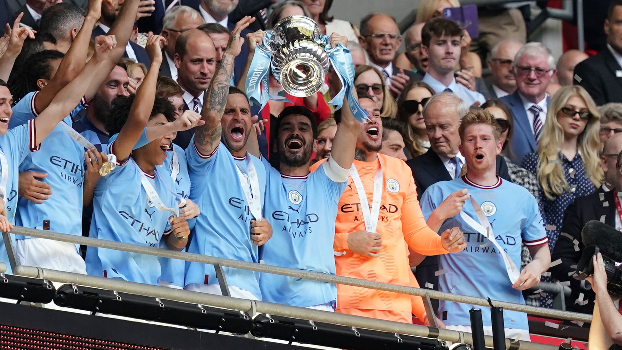 | Manchester City mengangkat Piala FA setelah mengalahkan Manchester United di final (Martin Rickett/PA) |